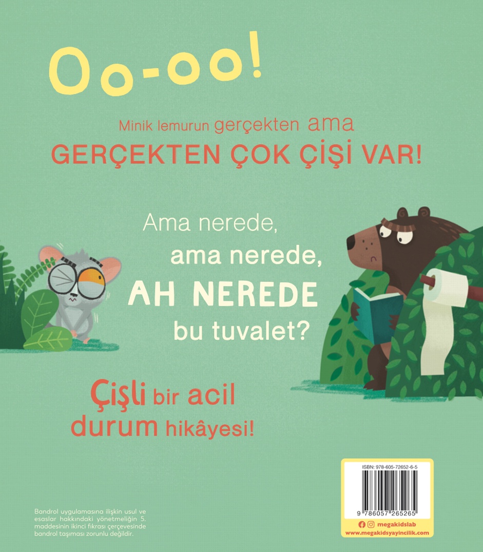 İngilizce Açıklama: Bush Baby is in a fix. She didn’t need a wee before she left home – now she needs one right away! Uh-oh! But what will she do if there’s just nowhere to go? A pant-wettingly funny tale of determination and self-awareness – packed with toilet humour!