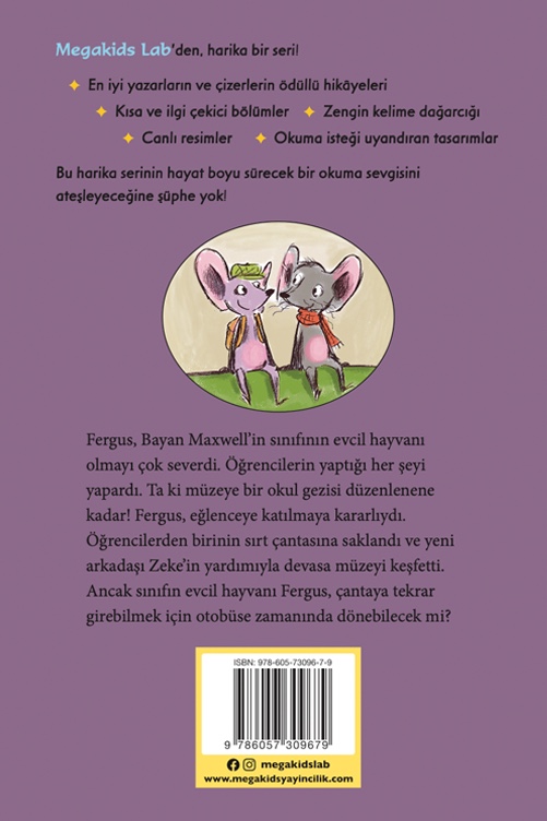Fergus, Bayan Maxwell’in sınıfının evcil hayvanı olmayı çok severdi. Öğrencilerin yaptığı her şeyi yapardı. Ta ki müzeye bir okul gezisi düzenlenene kadar! Fegus, eğlenceye katılmaya kararlıydı. Öğrencilerden birinin sırt çantasına saklandı ve yeni arkadaşı Zeke’in yardımıyla devasa müzeyi keşfetti. Ancak sınıfın evcil hayvanı Fergus, çantaya girebilmek için otobüse zamanında dönebilecek mi?